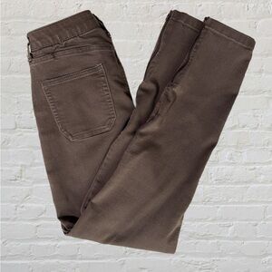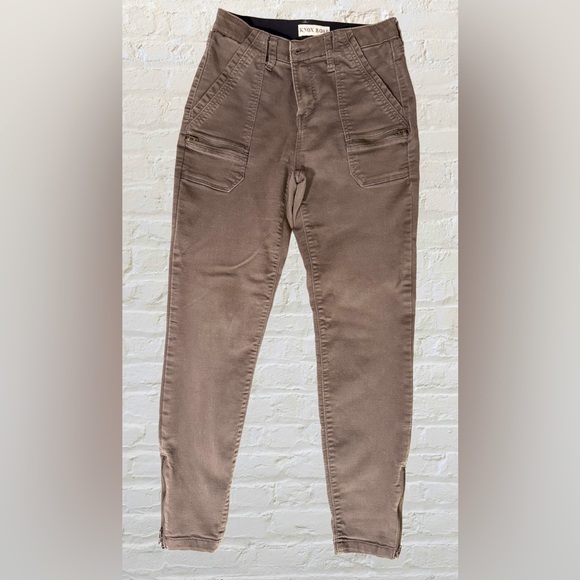 Brown cargo-type pants, fitted ankle length with zipper details.