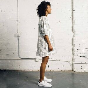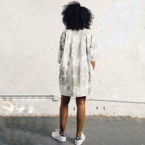 An oversized shift dress with elbow length sleeves and side seam pockets. Above the knee length. Pre-washed and pre-shrunk. 100% cotton with slight wrinkle effect. Printed, dyed and sewn in Brooklyn, NY. Due to the handmade dyeing process, color will vary from front to back of each of the garments, so no two dresses are alike.