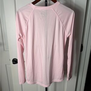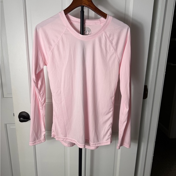 Soft light pink long sleeve top with a crew neckline. Comfortable, breathable fabric for everyday wear. Versatile layering piece that pairs easily with jeans or activewear. Light pink color adds a fresh, feminine touch.