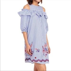 Framed with a ruffle that dances around cold shoulder cutouts, this striped print poplin shift dress from V by Violet Weekend feels fabulously fresh for your warm-weather style with floral embroidery along the hemline.