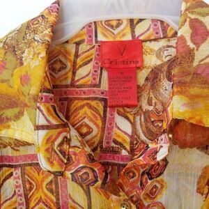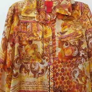 V CRISTINA SEMI SHEER AUTUMN COLORED TOP. SZ M