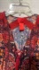 V CRISTINA BOHO, PHEASANT, HIPPIE STYLE BLOUSE, LONG ELASTIC SLEEVE LACE UP VNECK FRONT, HAS FRONT POCKETS GEOMETRIC RED PRINT,POLYESTER, LACE TRIM, WOODEN BEADS ON TIE STRINGS, PRE-OWNED IN EXCELLENT CONDITION SIZE S