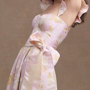 Charming blush midi dress with gold floral accents. Features delicate ruffled straps and a stylish waist tie. Ideal for elegant events.
