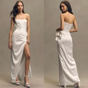 Meet the June sheath gown by V. Chapman, a romantic vision of femininity. Bustier styling, a daring front slit, and a side-tie sash will add elegant flair for a reception dress, for a bridesmaid, or a celebration that will always be remembered.