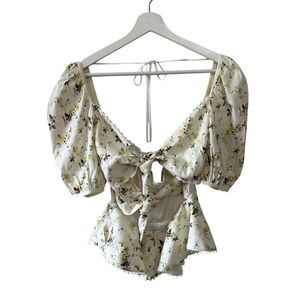 The Geneva Top is tie-front top with a peplum and a poof sleeve.