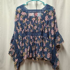 V Christina Blue Floral Blouse Women's SMALL Boho Bohemian Cute Vacation