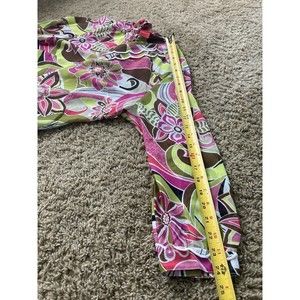 V Christina Women Sheer Long Sleeved Blouse Top Floral Rhinestone 70s size Large Button up, Rhinestone buttons, Sheer Multicolor floral and abstract design. Ruffle accents. 70s Look. In excellent condition. See photos for details and measurements.