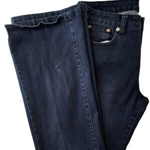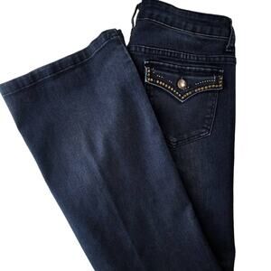 Features: button and zipper front closure, belt loops, 5 pocket, soft dark wash denim, flare bottom leg/bootcut, back pockets have flaps and beads. Great Condition.