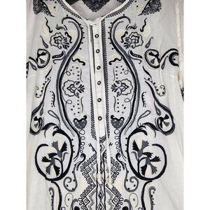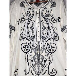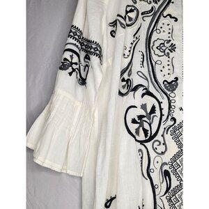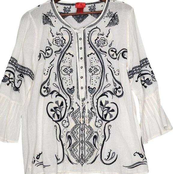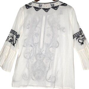 V Cristina Tunic Top in XL size features a crisp white shade with navy embroidery. This chic women's top has three-quarter bell sleeves, adding a touch of elegance to any outfit.
