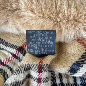 V. FRAAS Faux Fur Collar Tartan Plaid Ruana Fringe Hook Eye Open Poncho Wrap OS