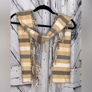 Acrylic scarf with fringe trim down the sides. Tan, white and gray
