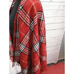 V FRAAS Women’s Red Tartan Plaid Fringe Wrap Scarf Poncho Topper Germany Made OS
