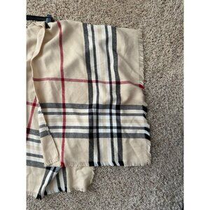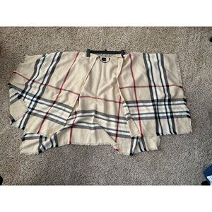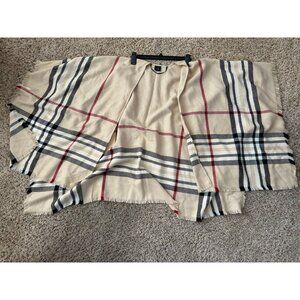 V. Fraas Beige & Red Plaid Acrylic Poncho Wrap Cape Open Front Fringed Edges