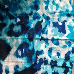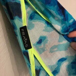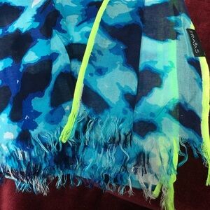 Super soft, large, lightweight, wrap scarf by V. Fraas in excellent condition! The abstract cobalt blue and aqua design is a subtle nod to animal print while the neon yellow striped edges add a cool contrast of color. In excellent condition, beautiful bold shawl, perfect winter wrap and beach coverup!