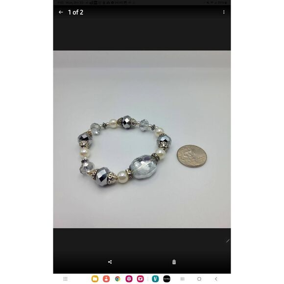 V Stretch Glass Pearl Bracelet Glass silver crystals and white faux pearls stretch bracelet. 2 1/4" across relaxed as a circle.