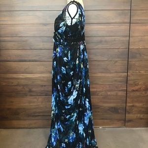 V Neck Beaded Silk Floral Blue Floor length Dress