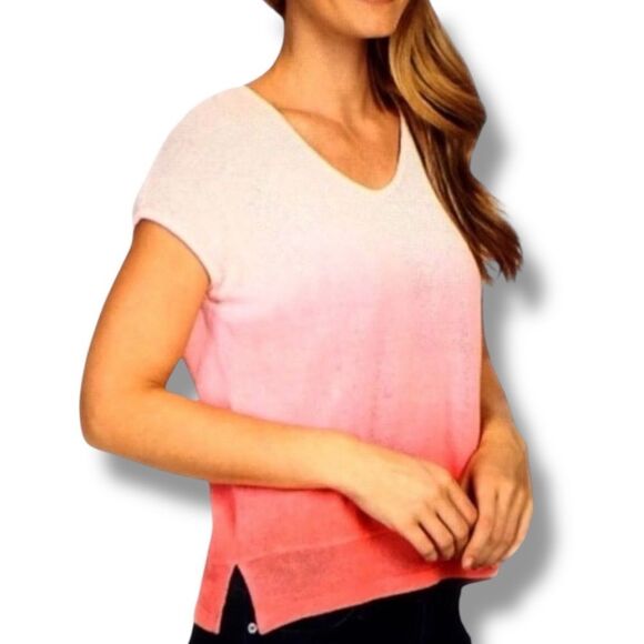 Elevate your look, enjoy this pink to white textured knit sweater lightweight top with a dip dye detail. V neckline, short sleeves, straight hemline with split sides split in relaxed fit, gradient pullover top. Great style for formal to casual wear year-round in breathable cotton! Ombre, Gradient, faded color by mod-a-doc. Hits at waist.
