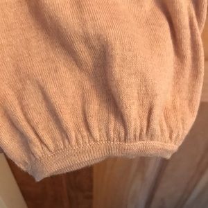 Beige lace sparkle trimmed top by August Silk. Soft knit made from 50% viscose, 40% silk, 10% wool. Flattering seam free shoulder with elastic wrist. Nice fit.