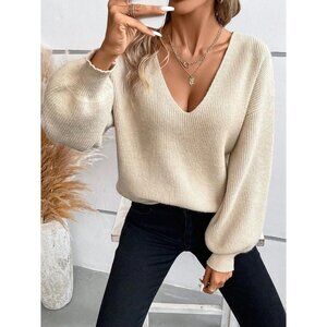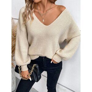 V Neck Sweater Women Knit Off Shoulder Long Sleeve Top Tie Back Apricot