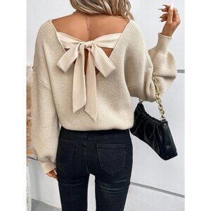 Features: Beautiful apricot knit sweater with a relaxed oversized silhouette. V-neckline with a signature satin bow tie back adds a feminine, statement touch. Perfect for dressing up or down, with a soft, slightly stretchy fabric that feels luxe against the skin.