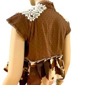 Brown textured top, crochet shoulder caps, brown lace, pleating, with cow hide print around ruffle trim. Short stand up collar, lightweight material, short sleeves, sweetheart v neckline, button down. Ivory crochet caps, brown and cow hide print ruffle trim button down animal print brown textured shirt!