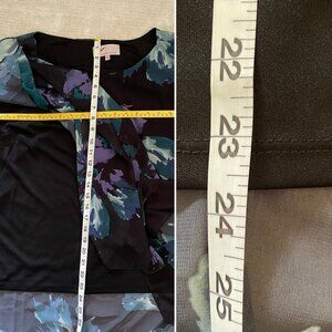 This V by Vanessa Williams asymmetrical flutter blouse in size 1X is perfect for women who love to express their unique style with a floral touch. Its black with floral pattern in the green and purple color palette is versatile and stylish.