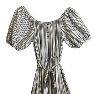 Features: pullover, stretch, elasticized boat neck that can be worn off shoulder, functional snap and button front, matching fabric belt, balloon sleeves, tiered, midi length, gray, white, lagenlook, prairie, elasticized at waistband and arm openings, peasant