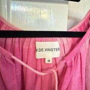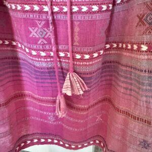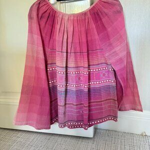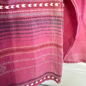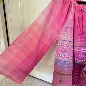 V de Vinster cotton bohemian style blouse. Size medium. V-neck, with tie closures and tassles. Pink, purple and gold pattern throughout, drop shoulder, straight sleeve to wrist. 100% cotton, hand made in India