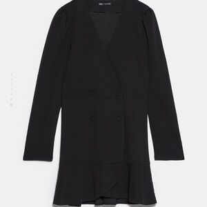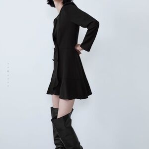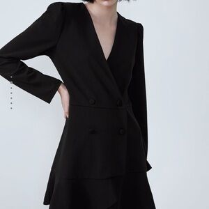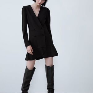 V-neck wrap front dress with long sleeves and puff shoulders. Flounced hem. Front buttoned wrap closure.
