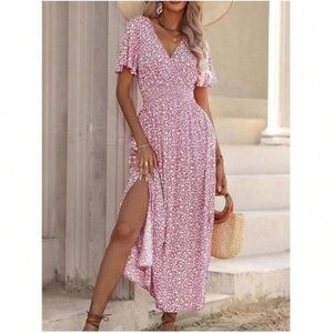 V neck flutter sleeve boho floral print maxi dress red