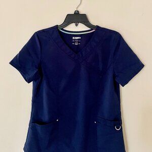 Navy blue V neck scrub top with pocket