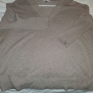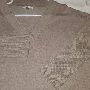 Tan v-neck sweater;is 3/4 sleeves. The bottom half is wider wear and sleeves are snuggly cuffed for comfort style. Super cute and comfy for winter. Smoke free and still in great condition. Size medium but wears like a large.