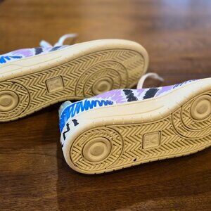This shoe celebrates Marni's eccentric take on fashion mixed with their ability to showcase individuality and creativity through collaborating with Veja. The sneaker portrays a nostalgic, DIY aesthetic of colorful scribbles printed over premium bovine leather. The right shoe is different from the left, highlighting originality. The tongue features a Veja x Marni logo. The heel has the Veja logo written on, while the back outsole has the Marni logo written in black.