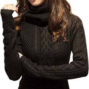 V28 Women Long Slim Fitted Dress Bodycon Turtleneck Cable Knit Sweater Black L