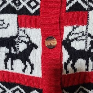 V28 Women's Festive Red and Black Reindeer Christmas Cardigan Sweater Size Small