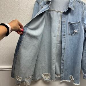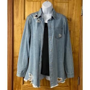 Description: Naturally distressed by manufacturer. Can be worn as a shirt, cardigan or denim dress. Snap front closure & sleeves, with raw frayed hemline, silver hardware in a light to medium blue denim material.