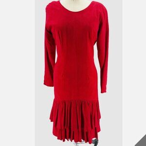 VAKKO Vtg 80s Red Suede Drop Waist Ruffle LSV Dress 6 Cowgirl Western Boho