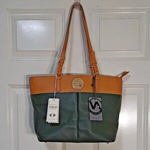 VALENTINA "Today is Your Best Day" Italian Leather Tote Bag Purse Olive Green & Tan NWOT