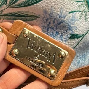 This beautiful Valentina Italia genuine leather bucket bag features a vibrant multicolor floral print with tan leather trim and gold-tone hardware. It’s roomy, stylish, and perfect for everyday wear or as a standout accessory for travel, work, or weekend outings.