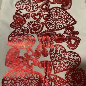 Nicole Miller Valentine's Table Runner. Length 70", width 14". Polyester and cotton, shiny red applique.