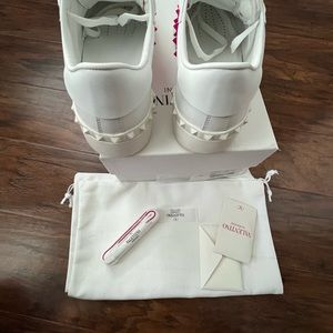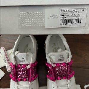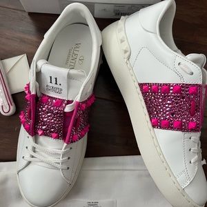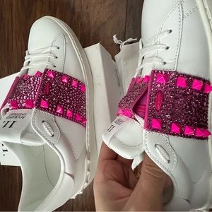 The AW22 low-top Rockstud Untitled shoes, one of Valentino Garavani's most well-known models, are offered in a white and Pink PP colourway. They have a calfskin upper decorated with the brand's signature Rockstuds, and a flat white rubber sole underfoot.