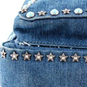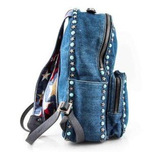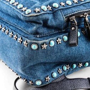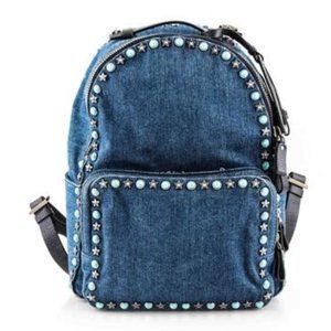 This coveted blue denim backpack from Valentino perfectly blends Italian elegance with contemporary detailing. It features a top handle, a top zip fastening, a front zip compartment, an internal logo patch, adjustable shoulder straps and a back logo patch. Signature Valentino Star Studs and blue cabochon embellishments give this piece and edgy spin.