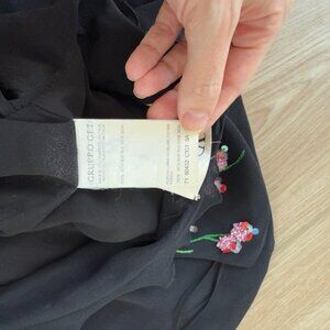 Jet black silk with beautiful beads, sequins, and threading to create a romantic floral cascading pattern