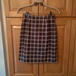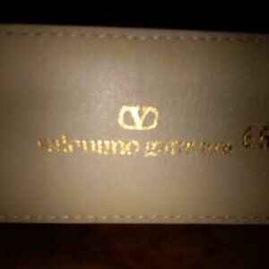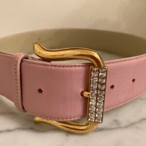Vintage Valentino Boutique 2 piece skirt suit. Size 4. The jacket is pale pink with pink pearl buttons down the front and on the sleeves. There is a slight stain at the top of collar (see photo) that is not very noticeable. The skirt is grey and cream checked. Includes belt with rhinestones marked Valentino Garavani.