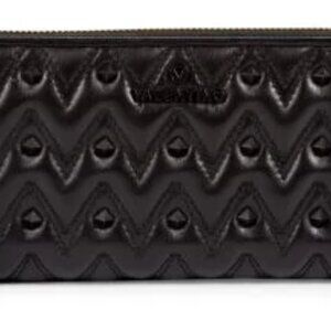 This leather wallet features a unique pattern of quilting with stud embellishments.