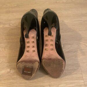 Gorgeous black Valentino patent leather booties with signature gold rockstuds on the soles, side zips and stiletto heels! Perfect for the holidays! Excellent used condition - only real signs of wear on the bottom soles. Booties come in the original box.