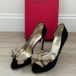 Gorgeous Valentino satin d'Orsay peep toe heels with gold rhinestone bows. Perfect for holiday parties! Great used condition with wear shown on soles and slight scuffs on the backside of one heel. See all pics for details! Shoes come with original box and Valentino dust bags.