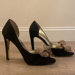 VALENTINO Black Satin D'Orsay Heels w/ Rhinestone Bows - EU 38.5