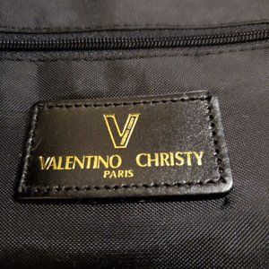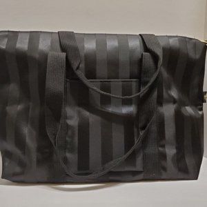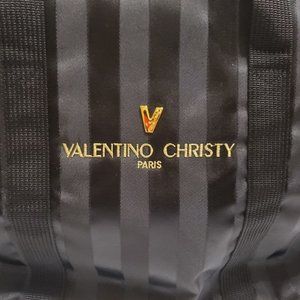 Beautiful large black shadow stripe Valentino Christy tote. Front slip pocket. Canvas straps. Top zipper. Lined interior with inner zip pocket. Leather Valentino tag inside. Gold V and Valentino Christy Paris embroidered in gold on front. 9 inch straps. 22”x14”x5.5”