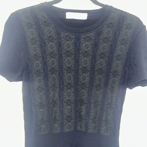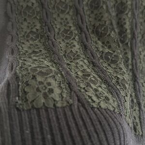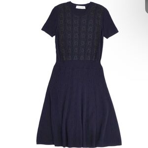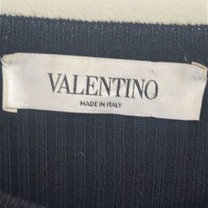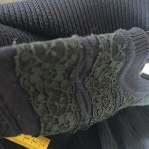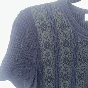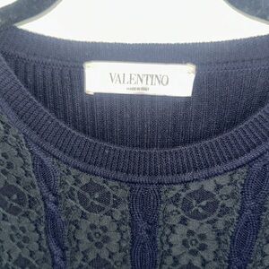 This very dark blue cable knit sweater dress with black lace on torso is Valentino. It has the Valentino label. There is no size or material tag. It has been removed so please go by the measurements. It is in good use condition showing just tiny bit of where on the shoulder lace.